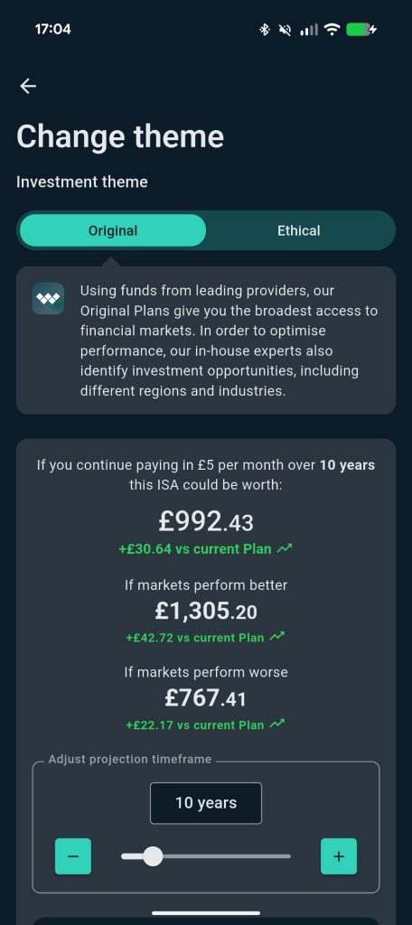 A great thing about this app is that you can choose the “theme” of investment like “ethical” or “orginal”. With this app you can kind of stay away from having to make any decisions and they do the rest for you.